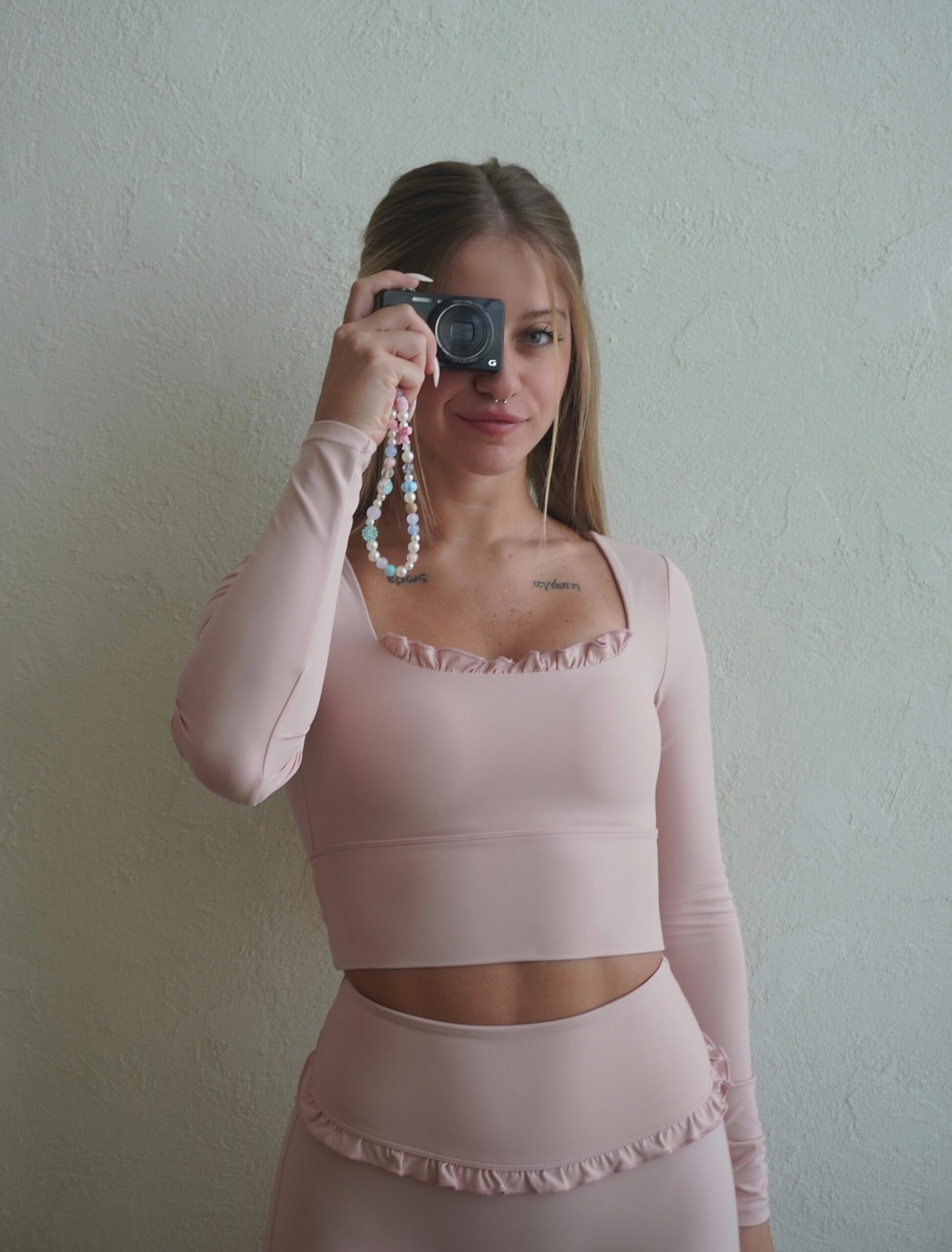 Meet the Aura Long Sleeve Top — your everyday essential designed to bring ease, beauty, and confidence to every movement. Crafted from buttery, body-hugging stretch fabric, it features a feminine square neckline, delicate ruffle trim, and a cropped silhouette that contours your shape with soft precision.